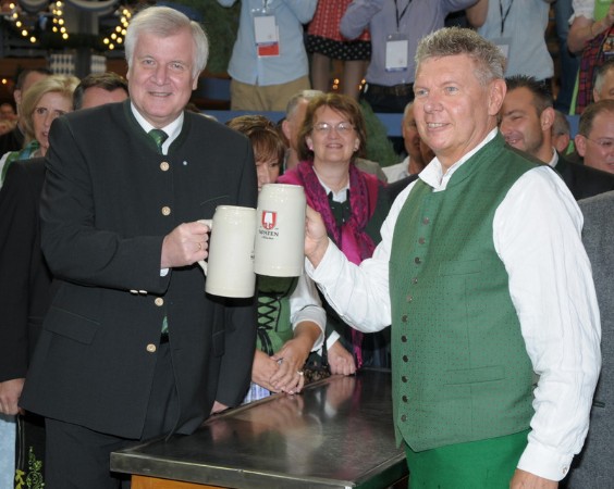 Die erste Maß wurde traditionell an den Bayerischen Ministerpräsidenten Horst Seehofer gereicht, der gemeinsam mit Reiter "auf eine friedliche Wiesn" angestoßen hat. Dabei auch Wiesn-Chef Josef Schmid, Wiesn-Stadtrat Georg Schlagbauer, die Spaten-Bosse Dr. Jobst Kayser-Eichberg, Bernhard Klier und Harald Stückle.